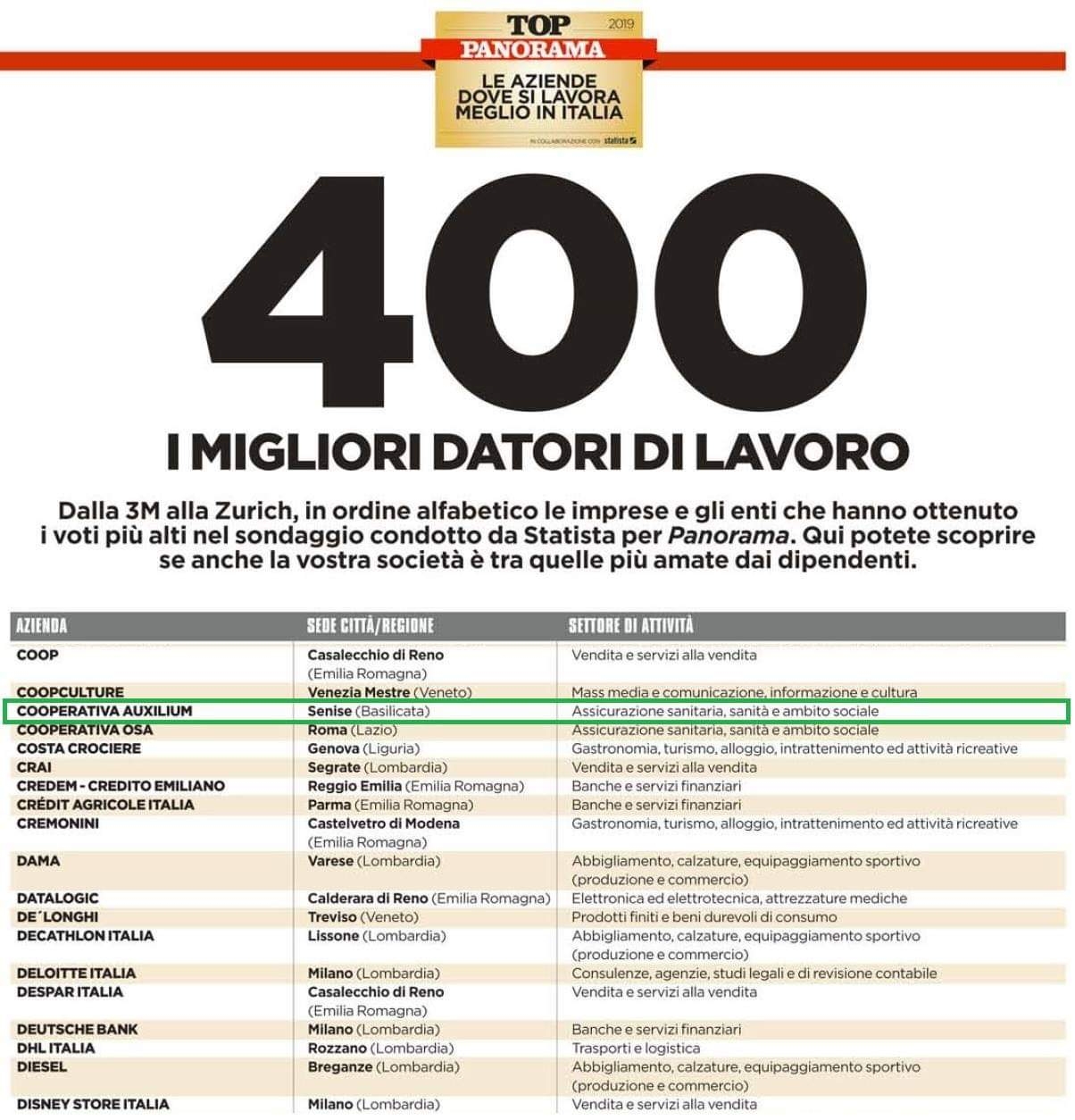 La Cooperativa Auxilium con sede a Senise è tra le 400 aziende ed enti dove in Italia dove le persone lavorano meglio, secondo l’indagine Statista-Panorama. Per scoprire quanto sono soddisfatti gli italiani delle aziende dove lavorano l’istituto indipendente di ricerca tedesco Statista ha realizzato un grande sondaggio, intervistando online più di 15 mila dipendenti di imprese che danno lavoro in Italia ad almeno 250 persone. Una platea di oltre 2 mila società in tutti i settori produttivi. E la cooperativa Auxilium si è distinta nel settore “Sanità e ambito sociale” della Top 400 2019. “Un bellissimo riconoscimento, che arriva mentre ci prepariamo a festeggiare nel 2019 il ventesimo anno della cooperativa – commenta Pietro Chiorazzo, presidente di Auxilium – quando nel 1999 abbiamo iniziato questa avventura umana e professionale eravamo un gruppo di universitari, che volevano impegnarsi nel sociale, ma fin dall’inizio capimmo che si può lavorare al servizio degli altri solo se in azienda si sta bene e la passione, la professionalità, l’impegno di ognuno sono valorizzati. Ringrazio tutti i lavoratori Auxilium per questo risultato”.