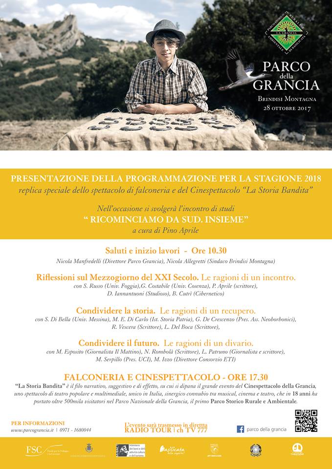 Per l’intera giornata di domani la Grancia diventa luogo di studio e destinazione turistica. A poche settimane dalla conclusione della stagione estiva del grande evento che si svolge a Brindisi di Montagna, la macchina del Parco Storico Rurale e Ambientale di Basilicata è di nuovo in moto per una replica speciale delle attività di animazione, del teatro falconeria e del cinespettacolo “La Storia Bandita”, dedicata ai tour operator italiani, ai quali sarà già presentato il programma della stagione 2018. In questo modo é chiara la volontà del Comune e del “Consorzio Eccellenze Turistiche Italiane” di voler far diventare la Grancia meta turistica nazionale, da inserire nei pacchetti degli operatori del settore, anche in combinazione con Matera, il Volo dell’Angelo e altre destinazioni lucane di sicuro interesse. A tal proposito  su iniziativa del sindaco di Brindisi di Montagna, Nicola Allegretti, e del direttore del Parco, Nicola Manfredelli, docenti universitari, studiosi, scrittori, meridionalisti , domani mattina, nel Parco della Grancia, dialogheranno sul Sud. Alle 10 e 30  un primo incontro sul tema  “Riflessioni sul Mezzogiorno del XXI secolo. Le ragioni di un incontro” con la partecipazione del professor Saverio Russo (Università di Foggia), del professor Giancarlo Costabile (università della Calabria), dell’ingegner Bruno Cutrì, cibernetico, dell’ingegner Domenico Iannantuoni, studioso di meridionalismo, e di  Pino Aprile, scrittore. A seguire alle 12 “ Condividere la storia. Le ragioni di un recupero” con il professor Saverio Di Bella (università di Messina), il professor Michele Eugenio Di Carlo (istituto di Storia Patria), Gennaro De Crescenzo, presidente associazione Neoborbonici, Lorenzo Del Boca, scrittore, e Raffaele Vescera , scrittore. Alle 13, poi, nuovo appuntamento socio culturale dal titolo  “Condividere il futuro. Le ragioni di un divario” con  la partecipazione di Marco Esposito (giornalista de “Il mattino”), Nicola Rombolà, scrittore, Mario Serpillo, presidente Unione Coltivatori Italiani, Mariano Izzo , Consorzio Eti, eccellenze turistiche italiane,  e Lino Patruno,  scrittore.  Nel pomeriggio, per chi volesse restare, in programma lo spettacolo di falconeria e la rappresentazione cine-teatrale del “La Storia Bandita”.