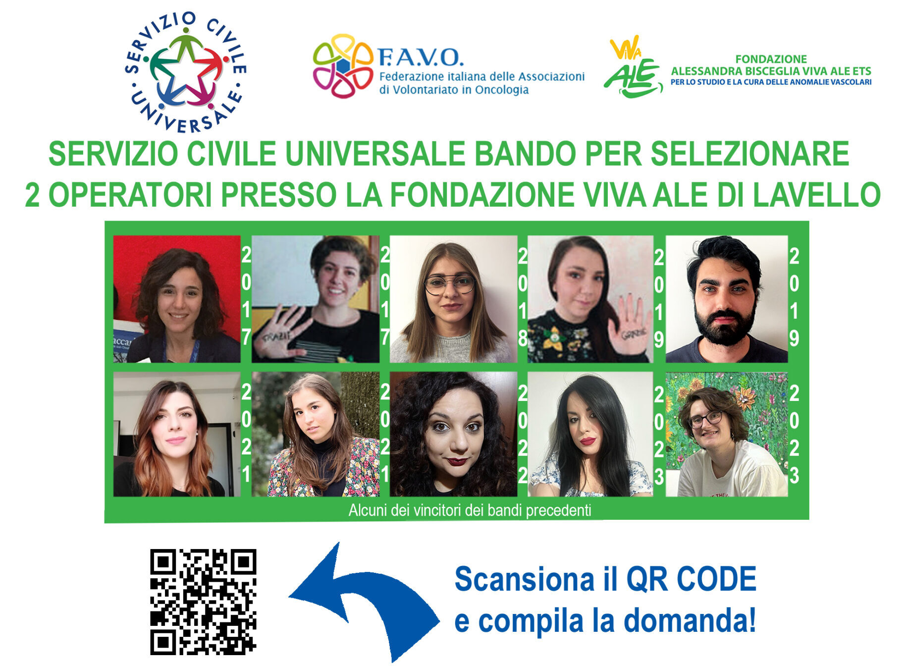 LAVELLO – Anche quest’anno, come avviene ormai dal 2017, la Fondazione Alessandra Bisceglia ViVa Ale ETS offrirà a giovani lucani dai 18 ai 28 anni d’età, la possibilità di svolgere nella sede di Lavello un’importante esperienza formativa di Servizio Civile. L’obiettivo è quello di selezionare due operatori a supporto delle attività che vengono svolte a sostegno delle persone affette da patologie rare e dei loro familiari. Gli interessati dovranno candidarsi al bando di Servizio Civile Universale – pubblicato sul sito ministeriale del Dipartimento per le Politiche Giovanili (www.serviziocivile.gov.it) – aderendo al progetto “Una rete per il malato oncologico – Riabilitazione, orientamento e accompagnamento ai servizi 2024”.